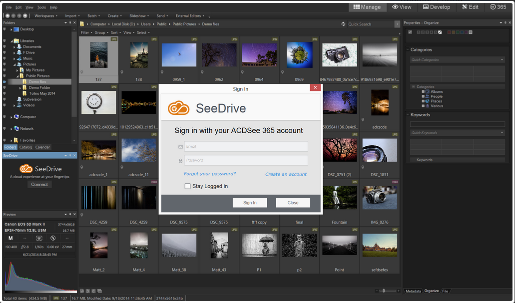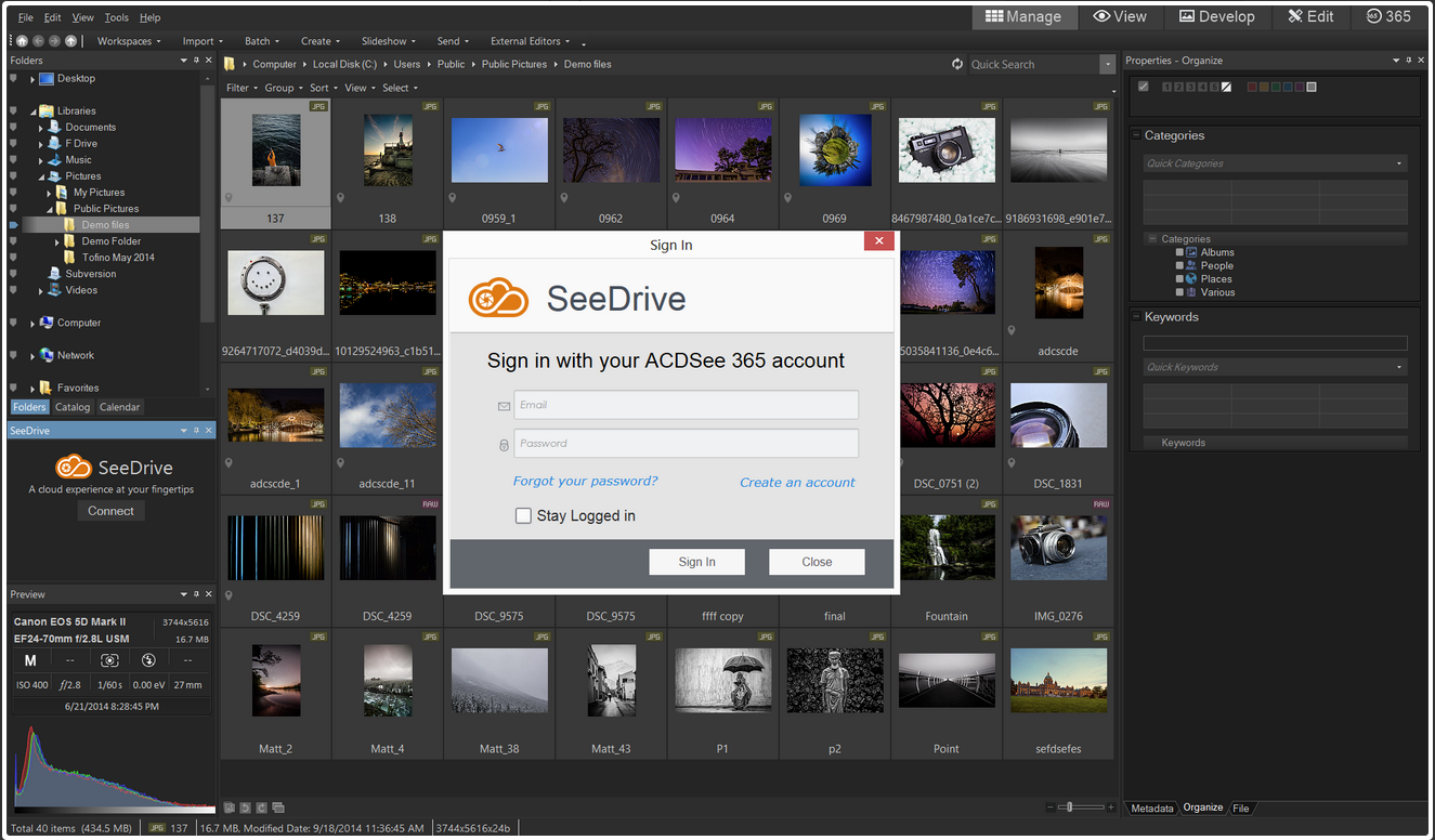 Online resimlerinize hızlıca ve kolaylıkla erişim ve yönetin, ailenizle, arkadaşlarınızla ve dünyayla paylaşın — ACDSee SeeDrive sayesinde tümü Manage modunda.