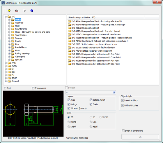 Mechanical - Standardized parts kütüphanesi, aşağıdaki gibi ulusal ve uluslararası standartlardaki en önemli elemanları kapsayan bir kütüphane içerir: