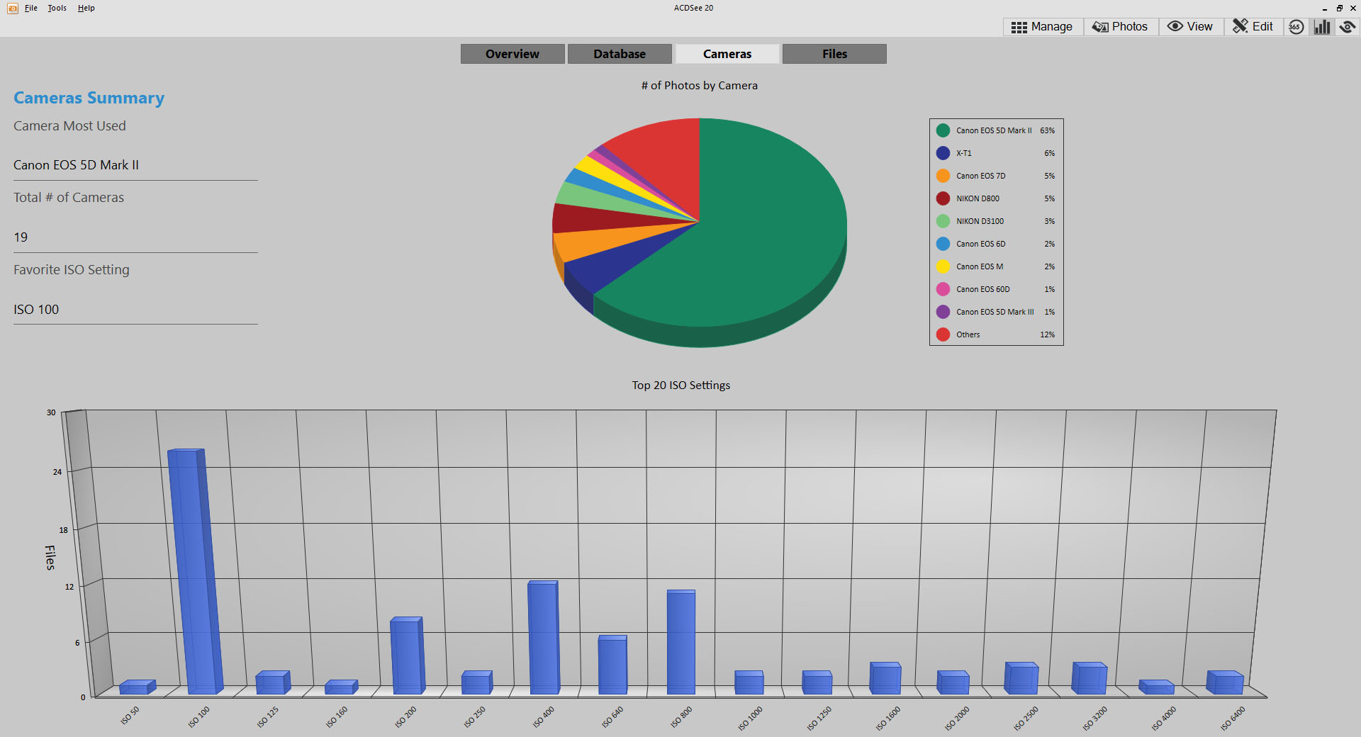 Dashboard modu, aylık ve yıllık fotoğraf sayısını, en çok hangi fotoğraf makinesini kullandığınızı, favori ISO ayarı, çözünürlük ve diğer bilgileri grafik olarak görüntüler.