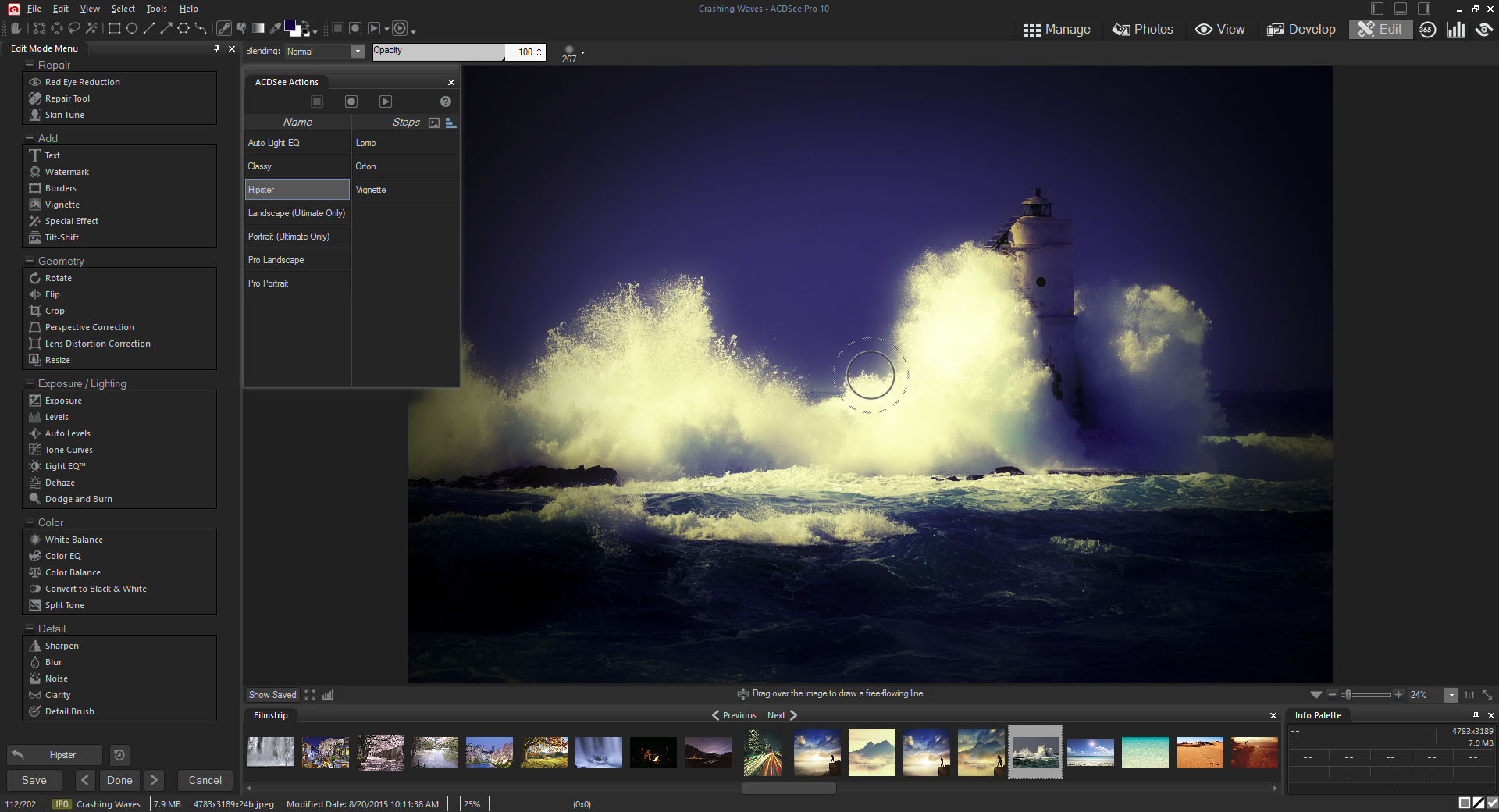 Batch Edit yalnızca birkaç düzenleme içeriyor olsa da, Edit modunun 200’den fazla düzeltmesini kaydederek, topluca uygulamak için ACDSee Actions penceresini kullanabilirsiniz.