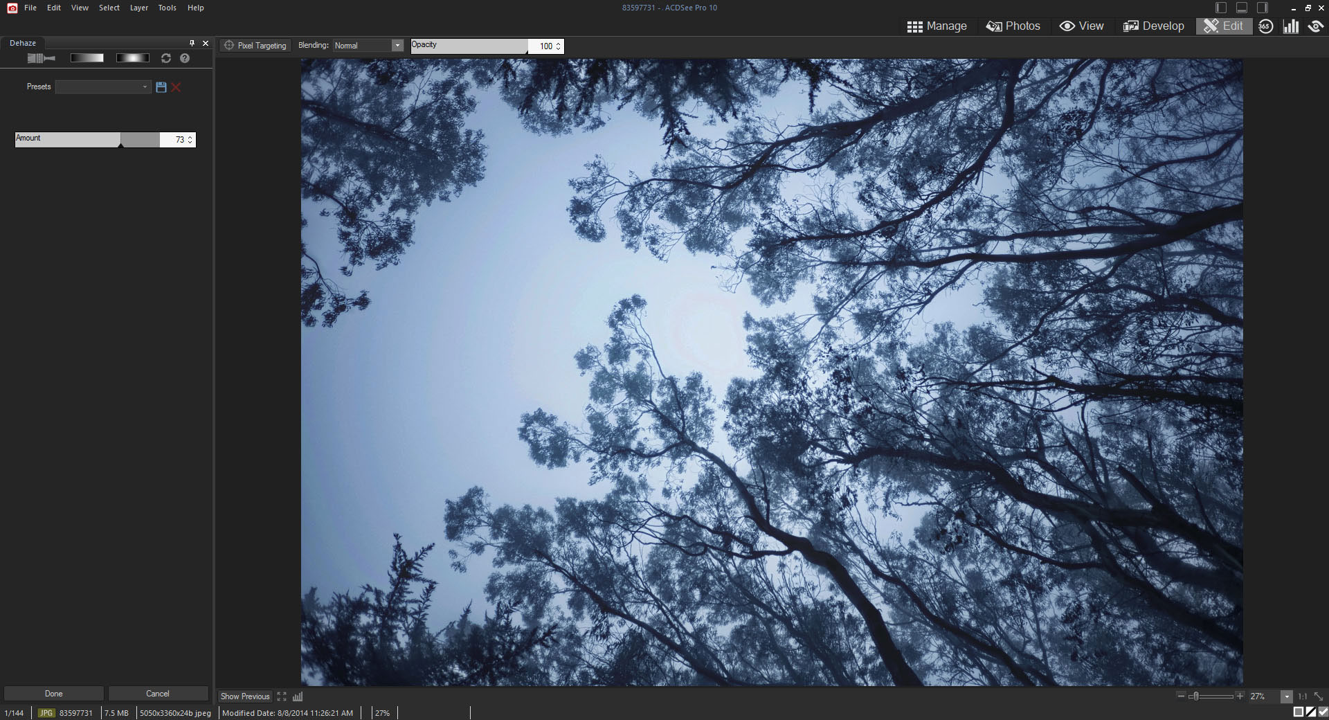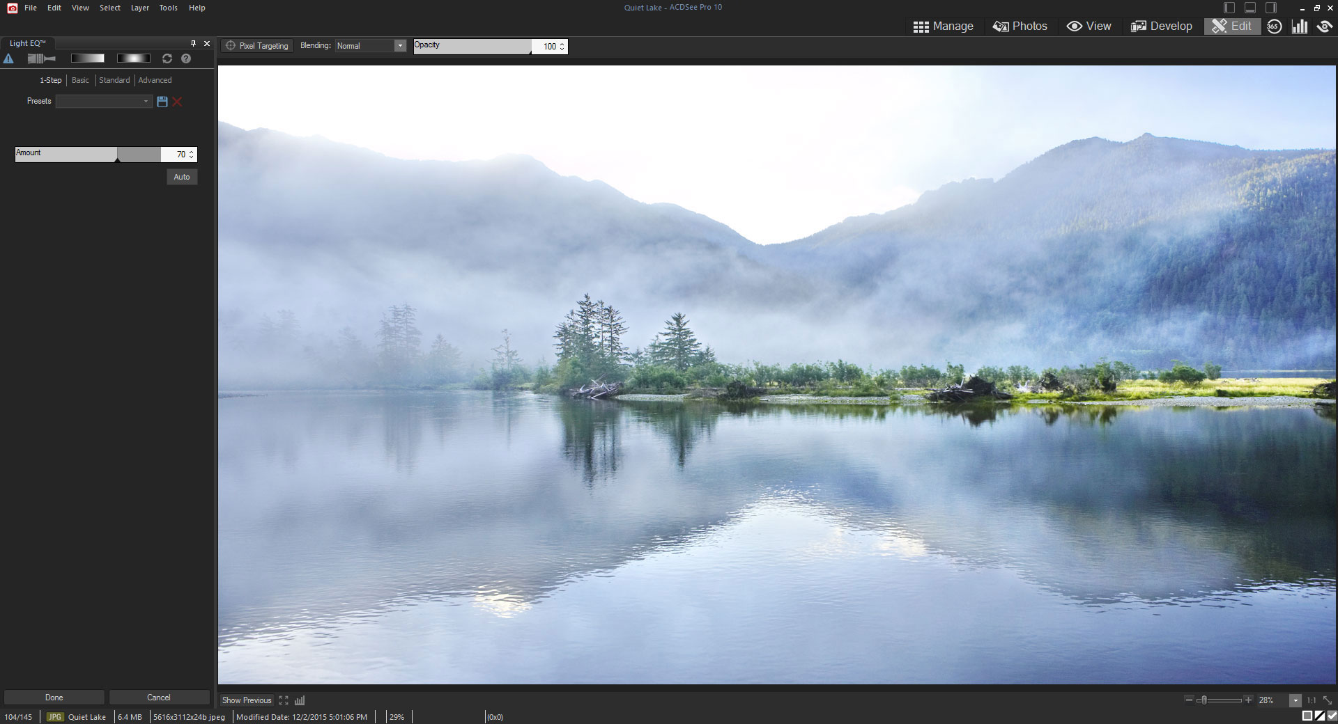 Develop modunun bozmadan düzenleme araçlarını kullanarak resimlerin pozlamasını, beyaz dengesini, renk profilini değiştirin, keskinleştirin, paraziti azaltın ve daha çok işlemi uygulayın. Profesyonel düzeyde piksel temelli düzenleme araçlarıyla fotoğrafları düzeltin ve geliştirin.