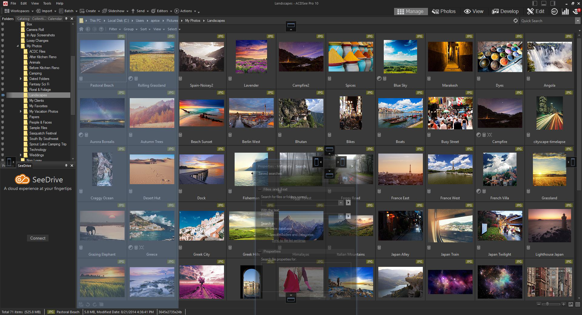 Metaverilere, dosya özelliklerine, tarihe, anahtar kelimeye, oylamaya, renk etiketine ve GPS konumuna göre resimleri bulun. Ayrıntılı aramalar oluşturun ve kaydedin, Quick Search çubuğunda tek tek kelimeleri veya söz dizilerini girin, yalnızca belirli klasörleri arayın veya belirli bir resmi bulun.