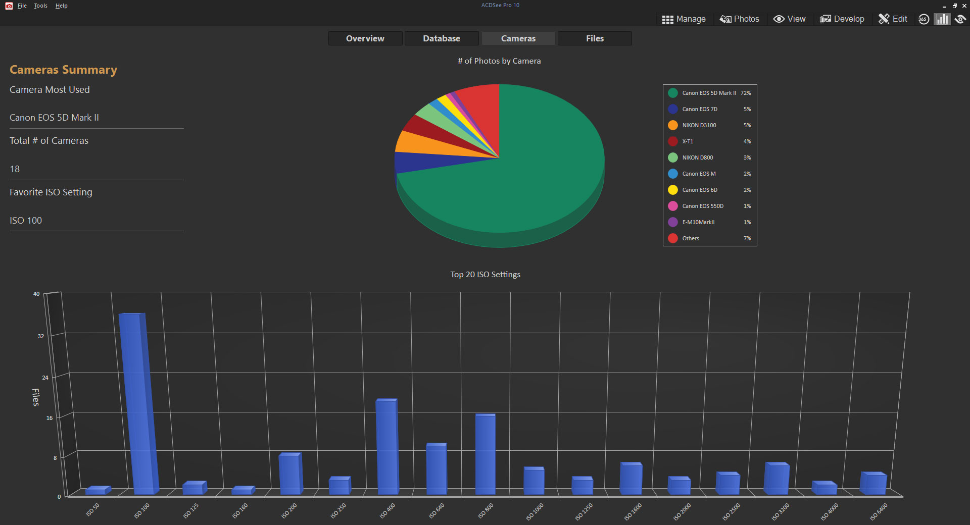 Dashboard modu, aylık ve yıllık fotoğraf sayısını, en çok hangi fotoğraf makinesini kullandığınızı, favori ISO ayarı, çözünürlük ve diğer bilgileri grafik olarak görüntüler.