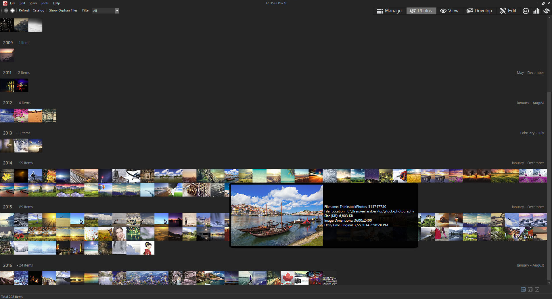 Photos modu, tüm resim koleksiyonunuzu tarihe göre görüntülemenin hızlı ve uygun bir yoludur. View modunda, fotoğrafları herhangi bir yakınlaştırma değerinde tam boyutta görüntüleyin, medya dosyalarını oynatın ve iş akışınızı kataloglamaya devam edin.